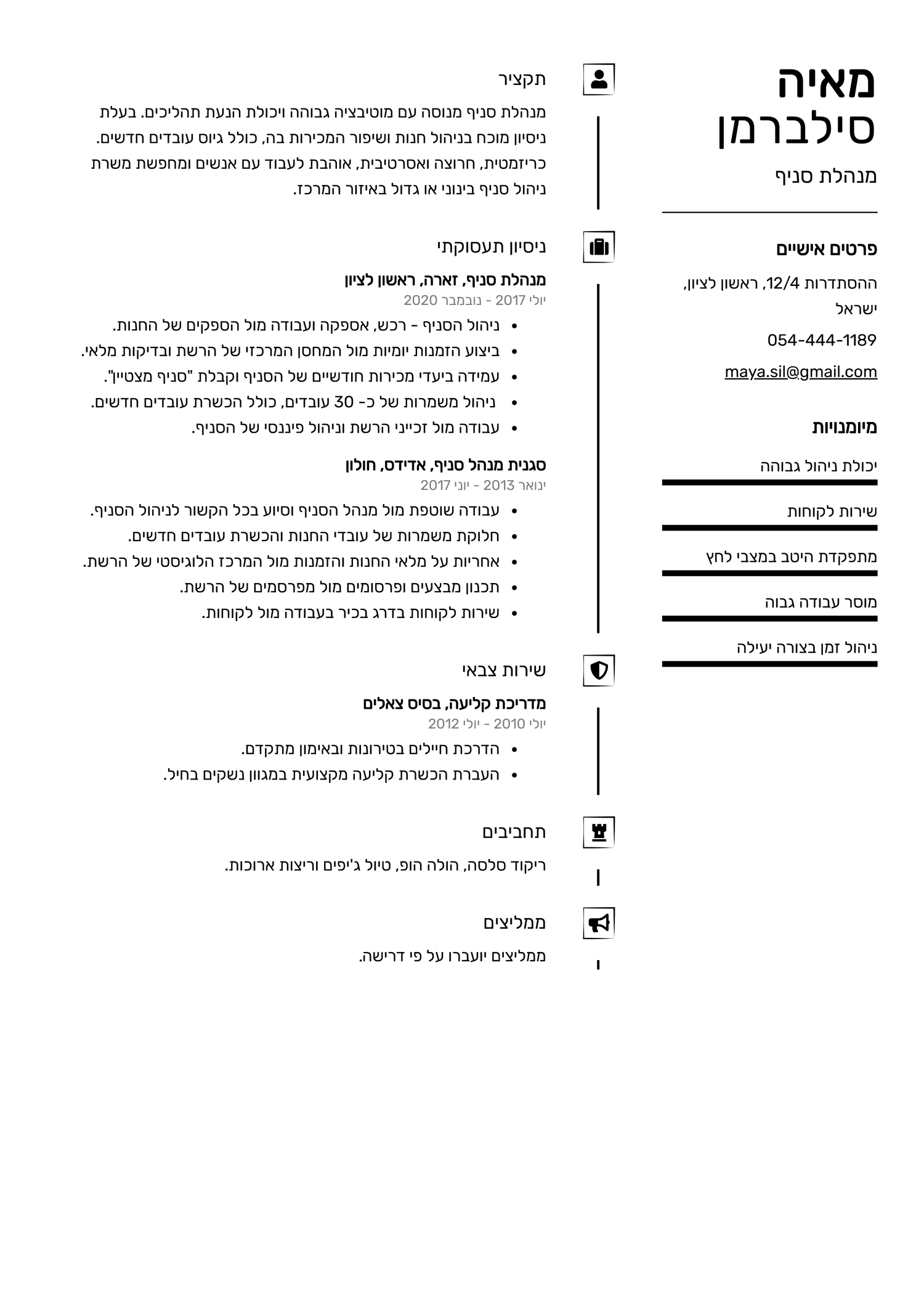 - ניסיון מקצועי: פירוט משרות קודמות, כולל ציון שם החברות, תאריכי העסקה, אחריות והישגים.
