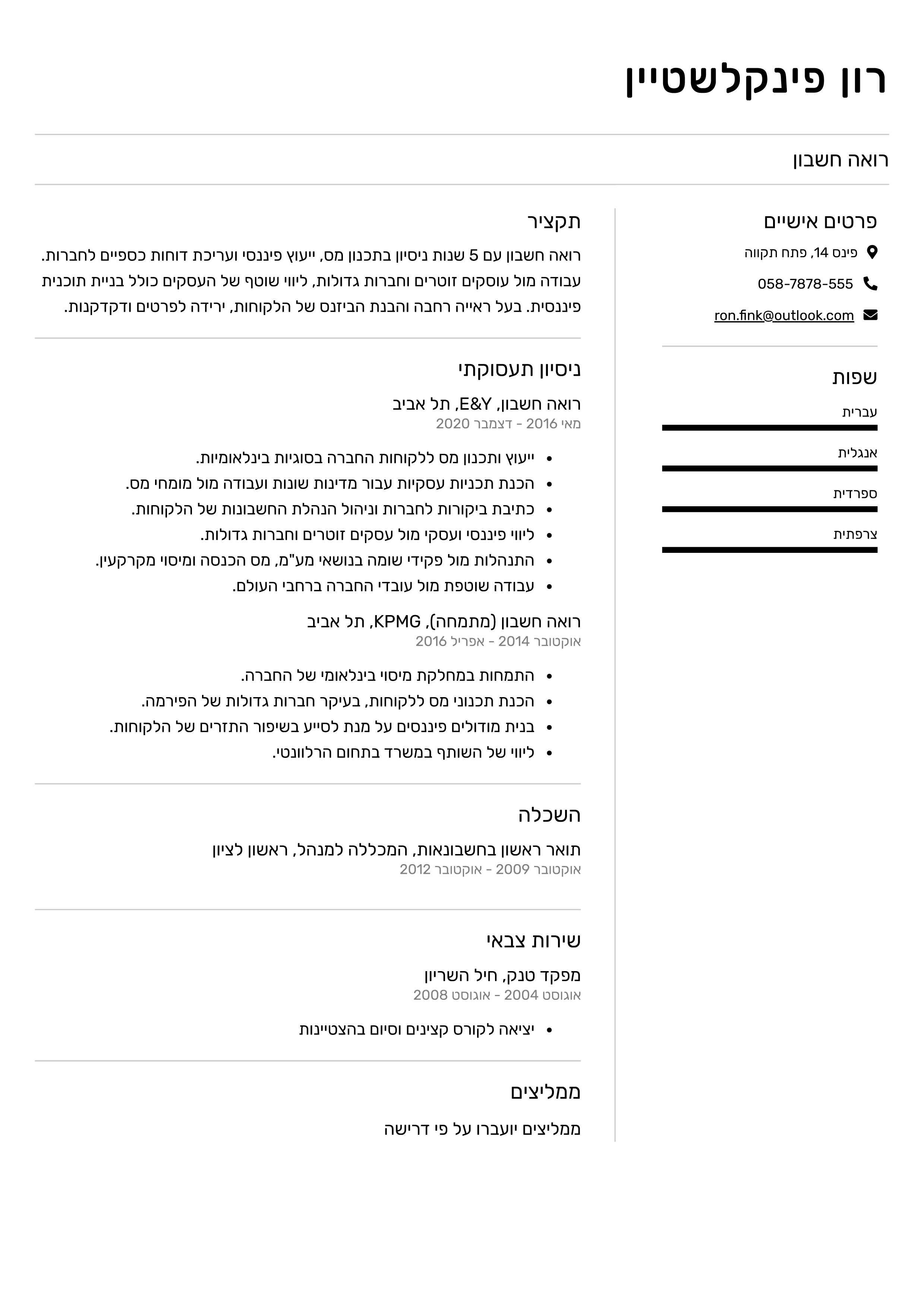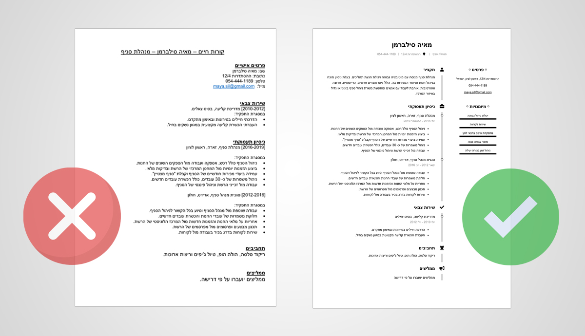 פפורמט מקצועי יגדיל את העניין של המגייסים בקורות החיים שלכם, ימשוך את העין ויסקרן אותם. זהו בעצם הטריק הראשוני שיגרמו למגייסים להתמקד בך בצורה רחבה מאשר בקורות חיים טקסטואליים מיושנים. זה לא אומר שהתקבלתם לעבודה, אך כבר אתם נמצאים ביתרון גדול על פני מועמדים אחרים.