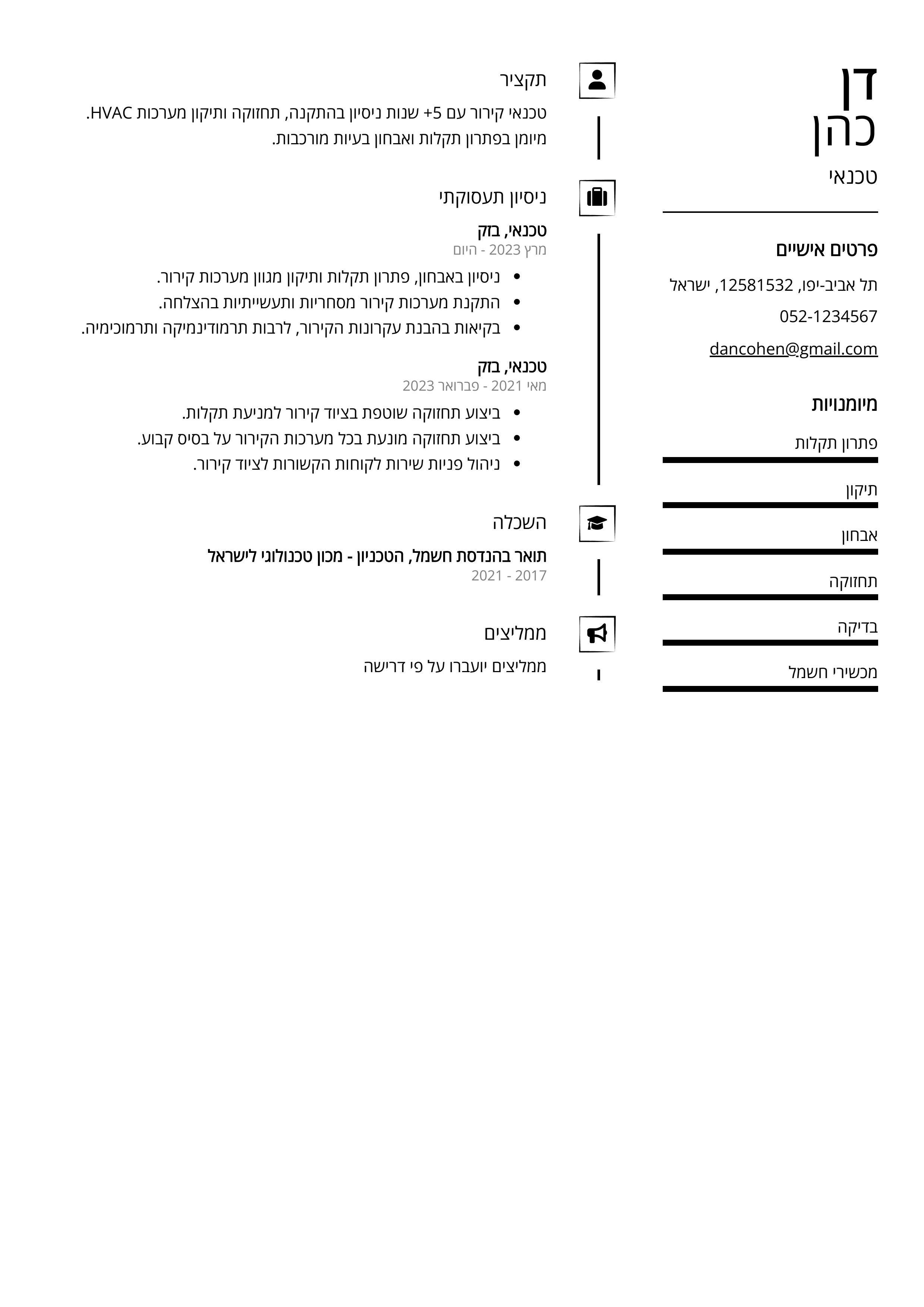 קורות חיים לדוגמה של טכנאי, המדריך המקיף ביותר בישראל לכתיבת קורות חיים של טכנאי, בעזרת הדוגמאות והטיפים שנכתבו על ידי מומחי גיוס תוכלו ליצור קורות חיים מרשימים ב- 5 דקות ותמצאו עבודה עוד היום!